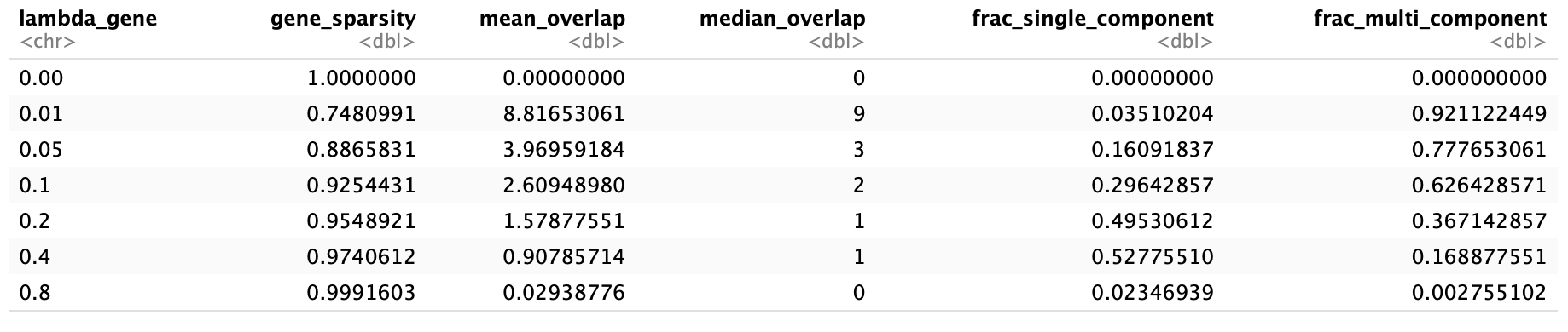 Based on overlap of genes across components wanted to increase sparsity be increasing lambda-gene values..