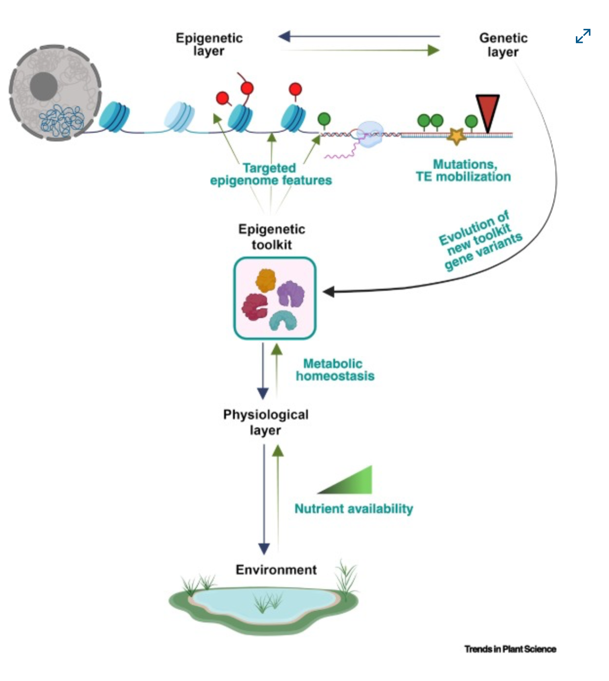 We propose a conceptual model involving an โepigenetic toolkitโ where plants sense environmental pressures to develop a complex crosstalk between physiology, epigenetic/epigenomic state, and their genetic code, and ultimately fine-tune adaptation at the organismal level.
