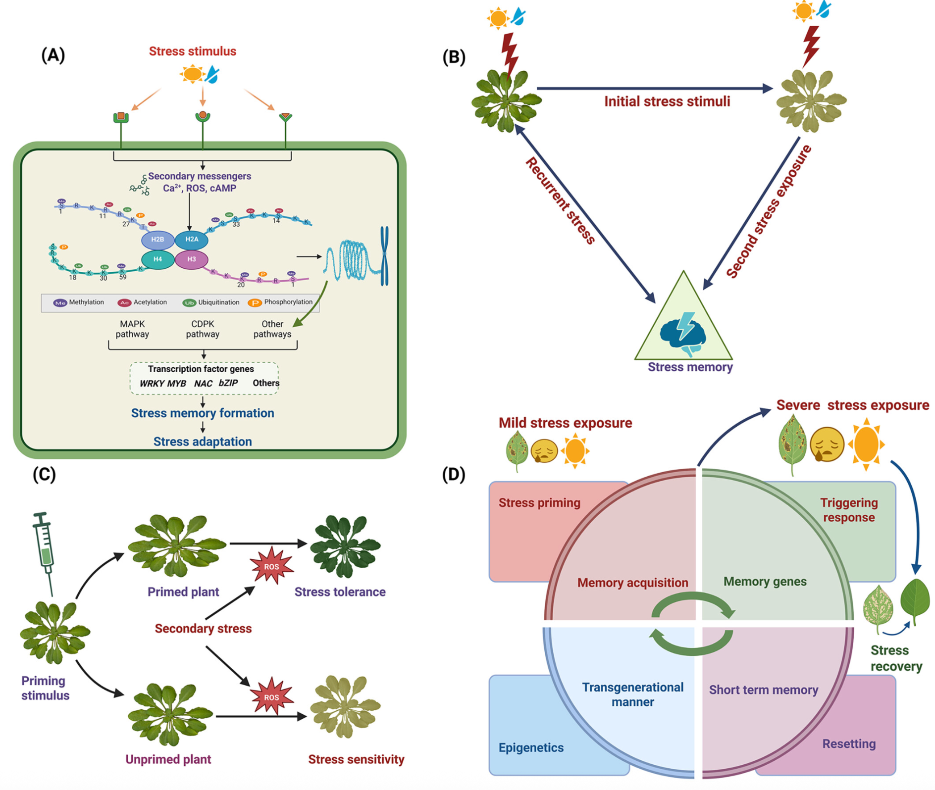 Plants exhibit a remarkable capacity to adapt to recurrent abiotic stresses, prompting a re-evaluation of traditional views on plant responses to environmental challenges. This review explores the intricate mechanisms of stress priming, memory, and adaptation in plants. Specifically, it details the molecular and physiological processes underlying abiotic stress priming, which serve as a gateway to understanding plant memory. Stress priming fosters resilience against diverse stressors through interconnected pathways involving hormone signaling, transcriptional regulation, DNA methylation, histone modifications, and small RNAs. These epigenetic changes orchestrate stress-responsive gene expression and can, in some cases, be passed on to future generations. This review distinguishes between somatic memory, intergenerational effects, and transgenerational inheritance to avoid conceptual overlap. By connecting short-term priming to long-term adaptation and potential heritability, this article proposes a paradigm shift in how plant resilience is understood, with significant implications for crop improvement under climate stress.